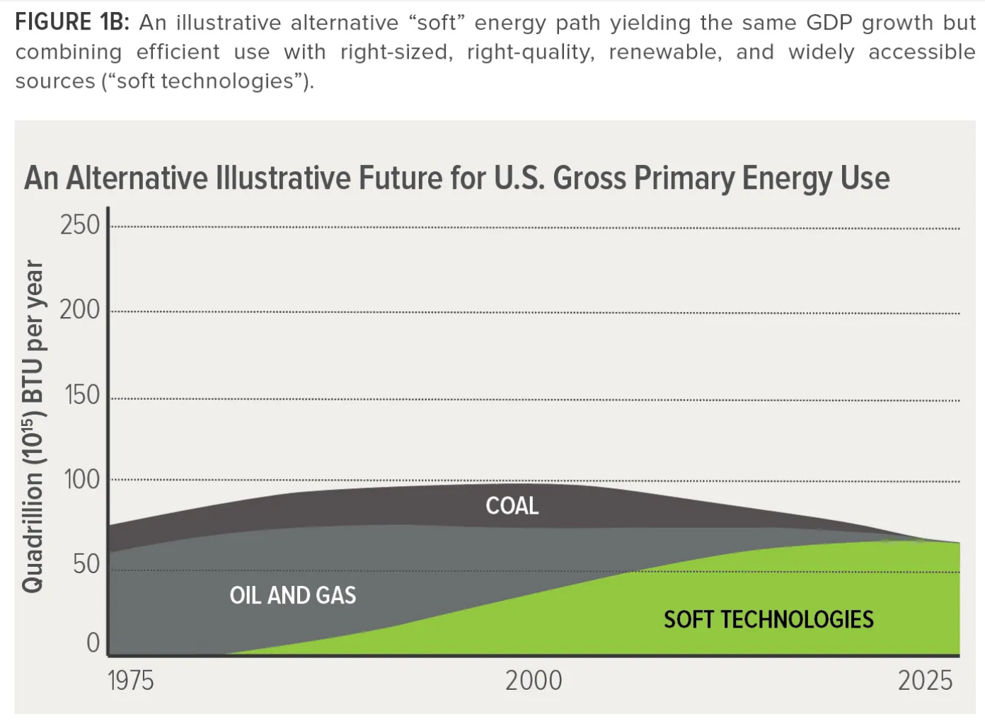 Lovins — regarded as an authority by the Natural Resources Defense Council, Sierra, and other major green groups — illustrates this well in his “soft energy path” charts. He envisioned replacing America’s level of 1975 energy consumption with a 100 percent renewable system that does not replace 100 percent of the 1975 energy. His view is that we should be substantially reducing per capita energy consumption as an integral element of the energy transition.