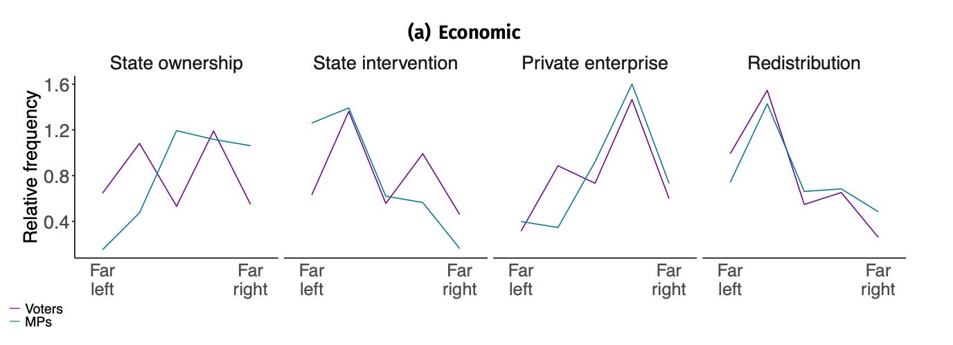 On economics, the gaps are very small. The main one is that there is a bloc of far-left voters who say yes to “major public services and industries ought to be in state ownership” but very few M.P.s agree with that. A different question, though, asks if “politics should abstain from intervening in the economy” and on that one there are more far-left M.P.s than voters.