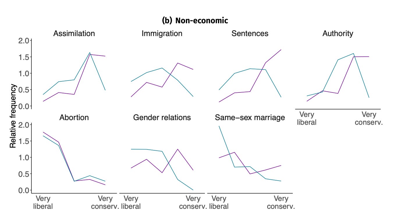 In proportional systems, that creates an easy space for new parties to fill. In the U.S., it created space for Donald Trump to remake the G.O.P. I don’t think “the center-left should become more right-wing on crime and immigration” is the only possible conclusion to draw from this data, but I think that everyone ought to take the data seriously and consider the tradeoffs involved in their own choices.