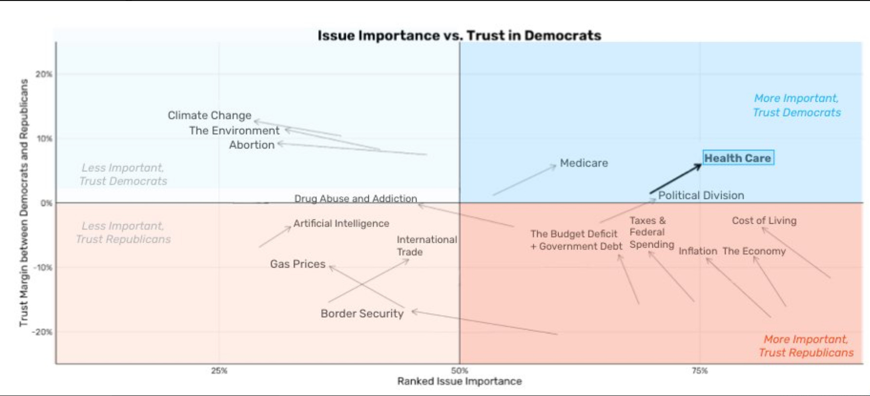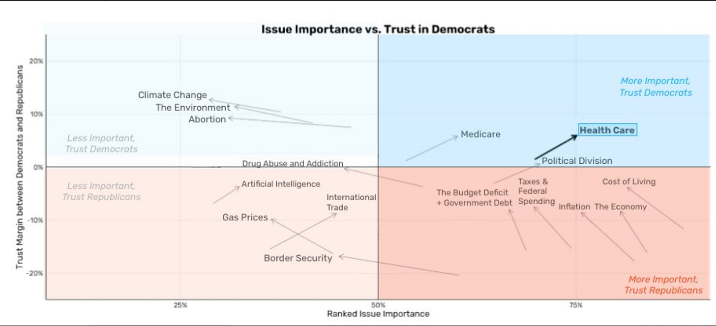 The chart on movement of Trust re Cost of Living is quite meaningful so @ ' I think the moral of this story is pretty clear: Democrats — not just those in tough races, but as many Democrats as possible — need to portray themselves as a political party that is obsessed with health care, the cost of living, and economic growth. That means prioritizing those issues in a real way when faced with a tradeoff on climate change and the environment.'