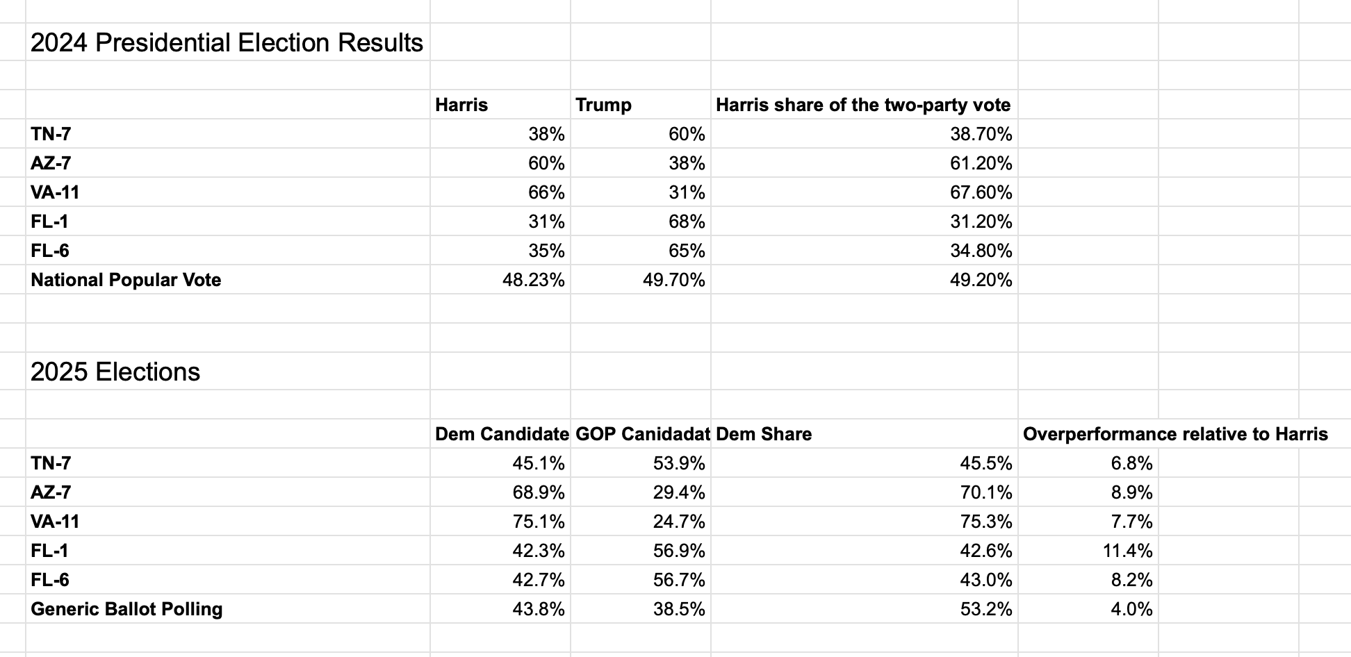 Here’s a little table I threw together that shows (on the left) 2024 presidential election results in the five House seats that had special elections in 2025 and then the special election results in those seats. I also threw in the national popular vote from 2024 and the current generic ballot polling average from Decision Desk for good measure.