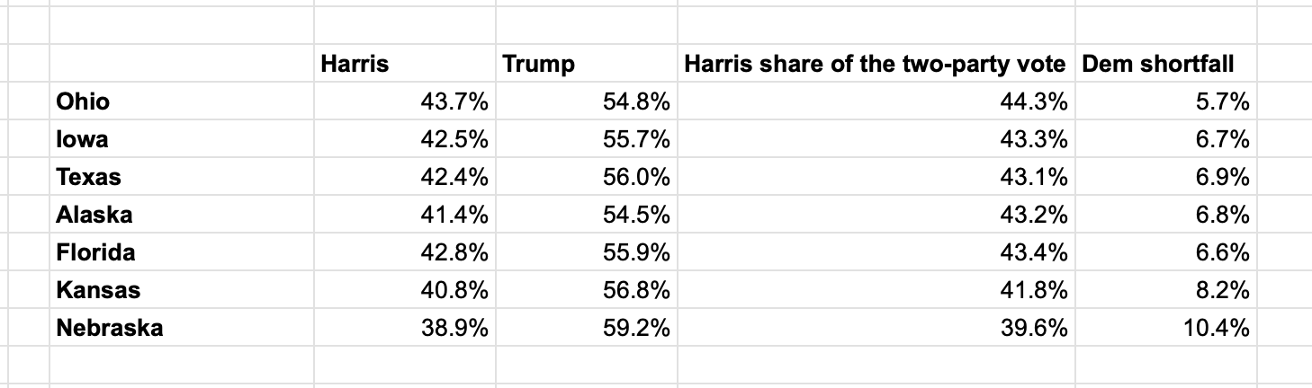 A four-point gain relative to Harris would be good enough to flip North Carolina (and Democrats have a very strong candidate there), at which point attention would turn to the messy situation in Maine. I think that if Dems flip two Senate seats and take the House, there will be a strong inclination to declare victory. If they flip North Carolina but lose in Maine, there will be bitter factional arguments about the outcome of the Maine Senate primary.
