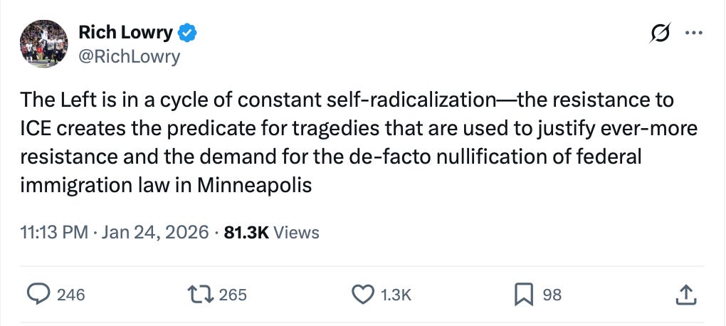I say this as someone who's horrified by what's going on in Minneapolis. Once this episode passes, with three years to go until the next presidential election, it might be better for people left of center to focus on the question "Why are we so weak? Why can't we decisively defeat them?" rather than questions of small-ball electoral tactics that might help in the short term (pivot to healthcare? a new immigration policy proposal?).