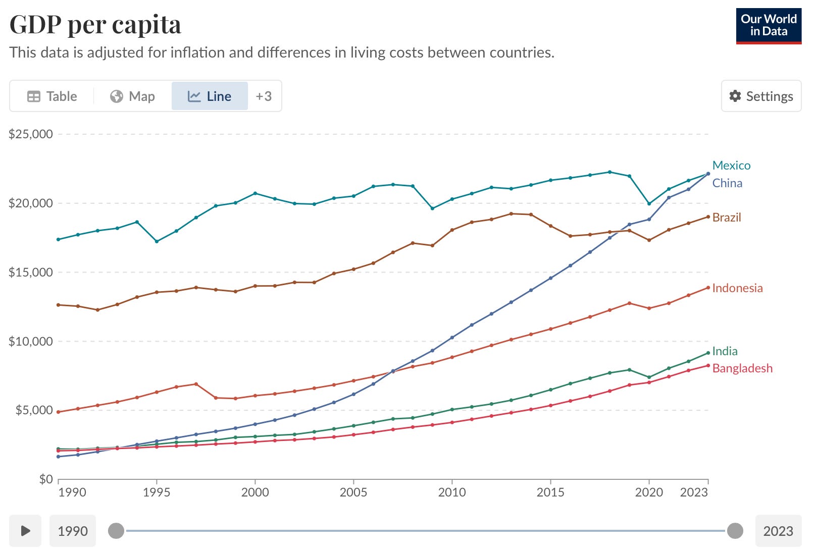 Unfortunately, the last 25 years have cast serious doubt on the theory that democracy and growth necessarily go together. China has zipped ahead of countries with considerably more democratic political systems in a way that makes it harder to dismiss Singapore or the Gulf monarchies as weird stuff happening in small countries.