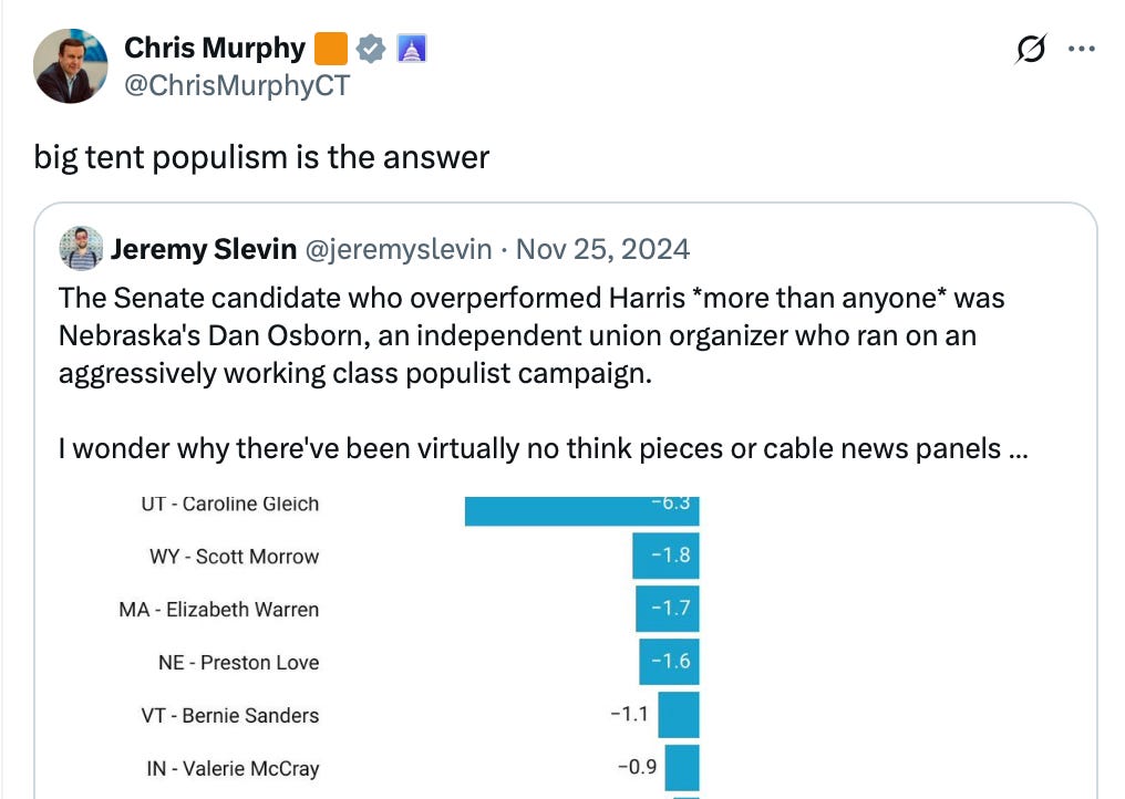 By contrast, all consideration of the merits aside, left-populists keep circling the drain around a very banal problem of power: If you want to build a political coalition that is sharply antagonistic to rich people, you need a big tent on cultural issues or else you make it comically easy for the rich to deploy those cultural wedges against you and win. This point is sporadically acknowledged by the proponents of left-populism, but neither Chris Murphy nor Bernie Sanders (for whom Jeremy Slevin is a staffer) is remotely willing to make the kind of moves to the center on culture and energy issues that would make the big tent they’re talking about possible.