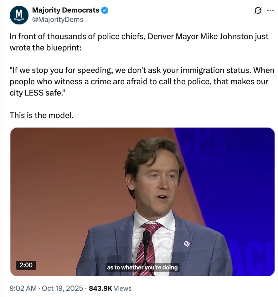 In this immigration message from Denver Mayor Mike Johnston, he’s offering a traditional account of why many local police departments don’t participate in immigration enforcement. It makes perfect sense and is a totally reasonable immigration message if you believe that, at heart, Mike Johnston is a tough-on-crime guy who sincerely believes that crime is bad and that criminals should be punished. In the Democratic Party of 15 years ago, when John Kerry (in 2004) and Barack Obama (in 2008) were winning endorsements from the national police unions, any Democratic politician who explained that his approach to immigration enforcement was motivated by holistic concern for crime and public safety would have a relatively easy sell. Today, I’m sure people in the blueish state of Colorado find this credible, but skeptical voters probably don’t.