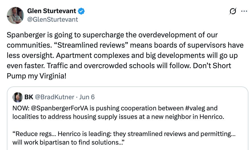 And yet the outraged response from Glen Sturtevant, a young up and coming Republican in the state senate, makes it sound like she’s putting forward a visionary statewide deregulation plan that would unleash incredible levels of growth. I wish he were right!