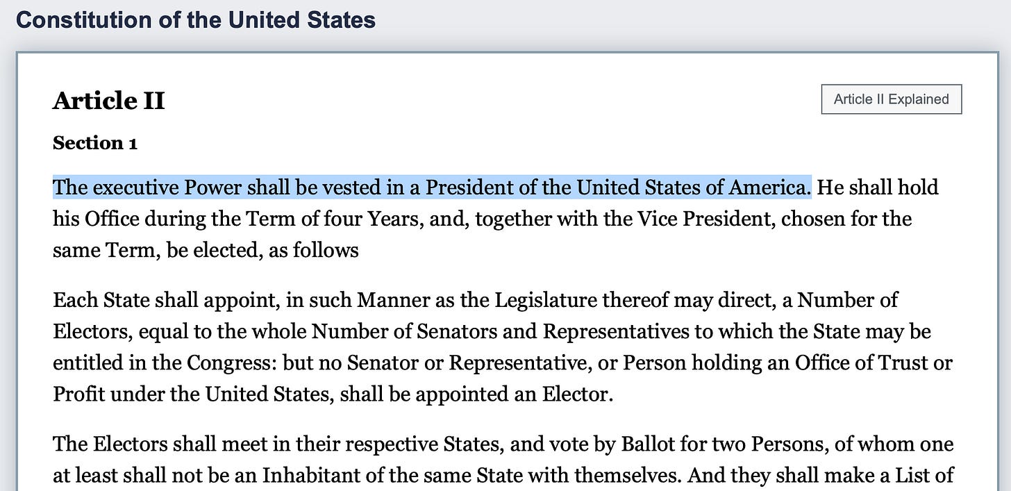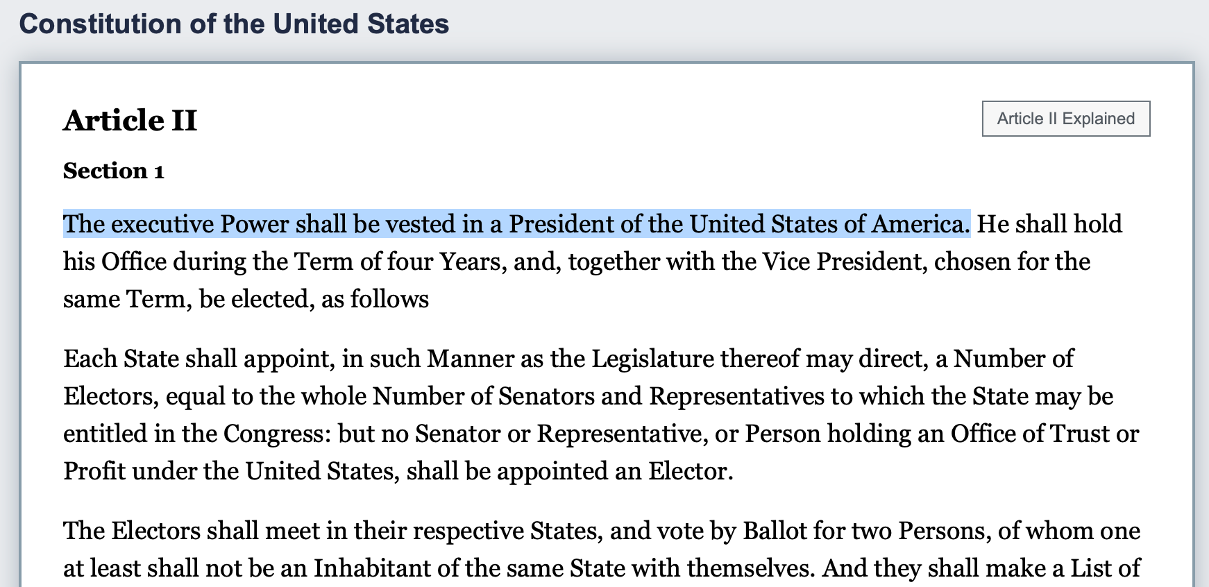 To me, the whole argument that independent agencies and rules against the president firing people violate the Constitution are insane. The entire case for this is literally this single non-substantive sentence that appears at the beginning of Article II of the Constitution. The text just does not say anything at all about who can or cannot fire whom or what Congress’s authority in terms of setting this up is.