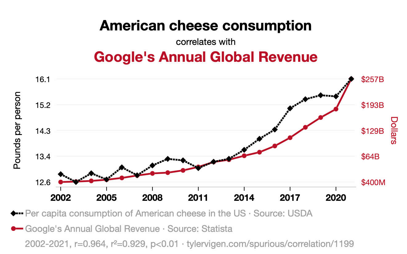 Sensible, informed, honest people understand that post hoc ergo propter hoc is a fallacy and that correlation is not causation. This chart is not good evidence that cheese consumption is driving Google’s revenue.