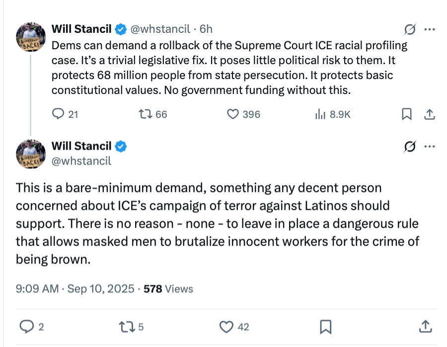 Basically, I was arguing for a harm-reduction shutdown. In a world where members and the base are champing at the bit for a fight, it’s best to pick a fight that you have some vague chance of winning and where, even if you lose, getting the issue in the headlines has upside. The risk is that if everyone who sympathizes with Glassman’s points takes his position, the baton passes to guys like Will Stancil, who want Democrats to pick obviously unwinnable fights that do nothing to help in any of the key Senate battlegrounds.