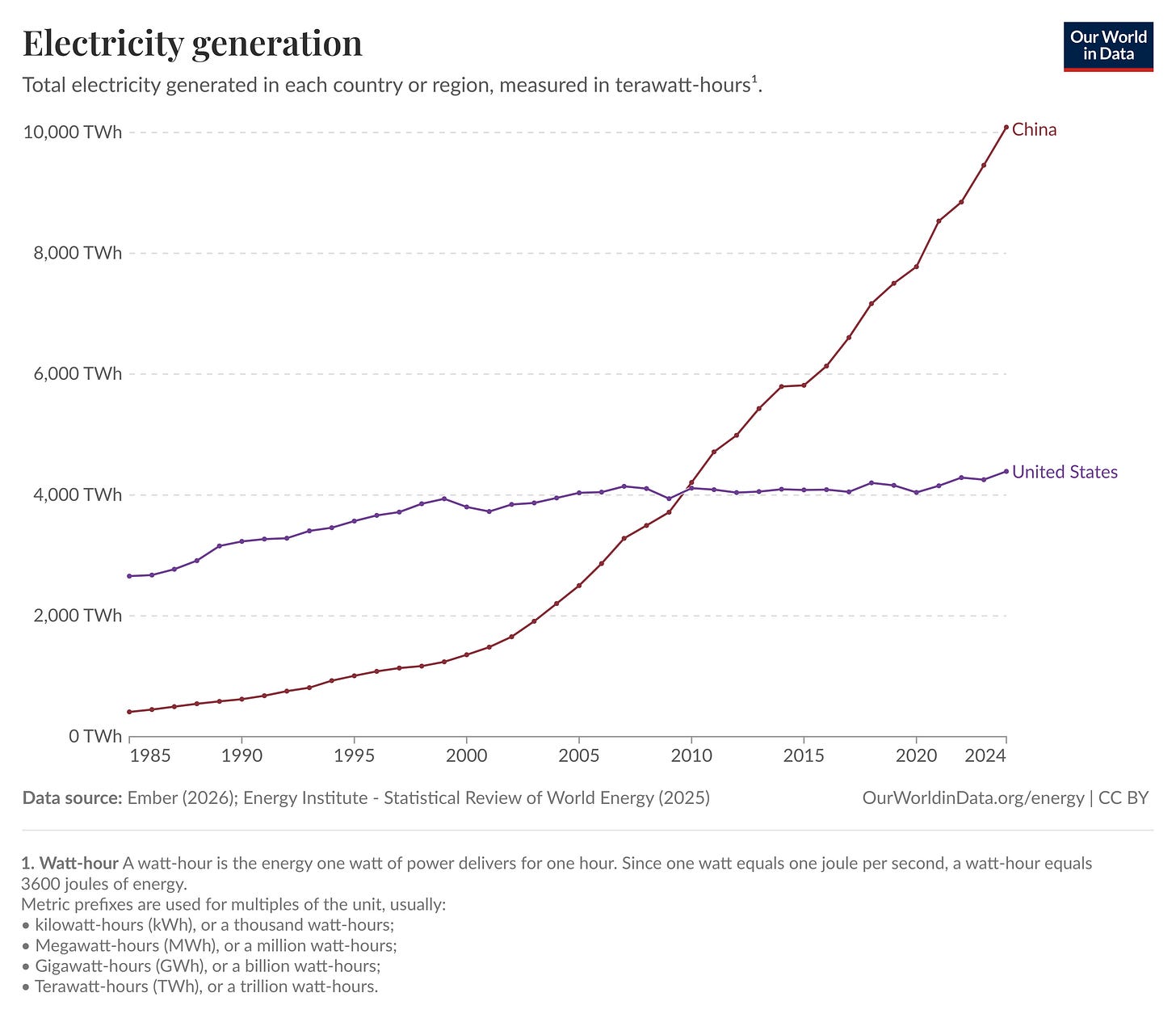 I don’t have a fully fleshed-out theory of what this should look like. But again, just look at that chart of Chinese versus American electricity generation. Shrinking the utility share of the electricity pie isn’t aligning our policy with our goals. We need to start from the premise that we want generation and more transmission, and adopt regulatory structures that support growth rather than maximizing short-term operational efficiency.
