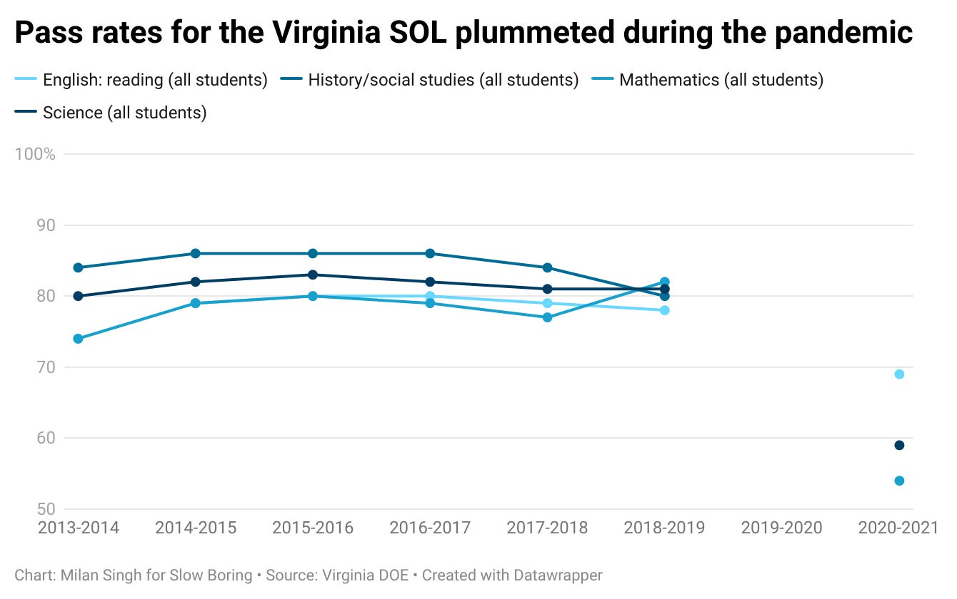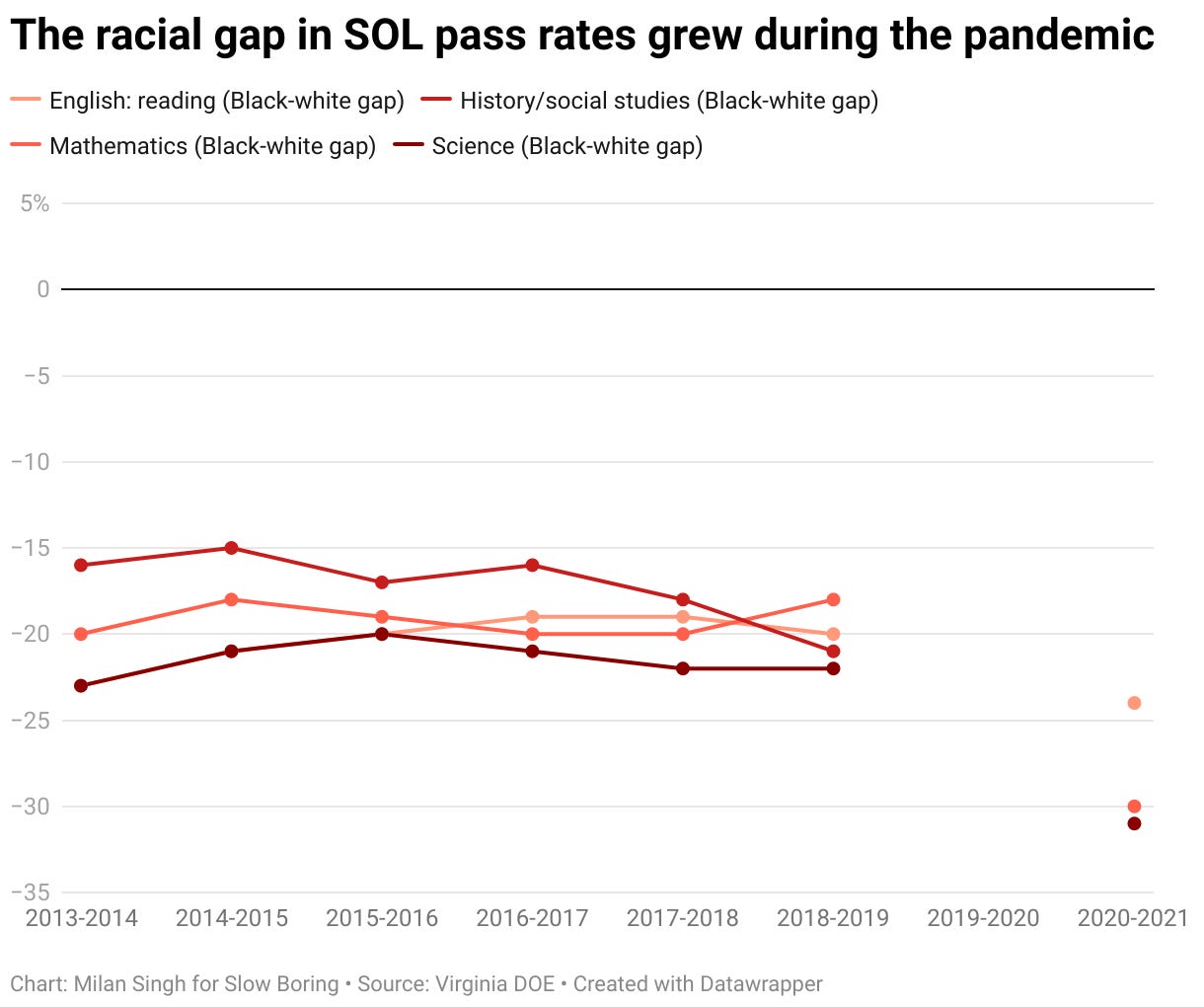 It turns out that they are not. In Virginia, for example, student test scores plummeted and the racial gap in scores exploded (there’s no data for 2019-20 because of the pandemic).