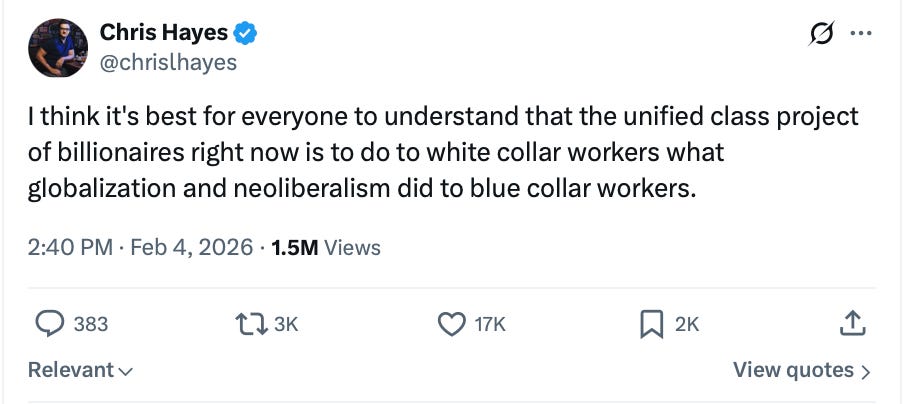 Chris Hayes remarked last week that “the unified class project of billionaires right now” is to immiserate white-collar workers in much the way that globalization and neoliberalism allegedly did to blue-collar workers.