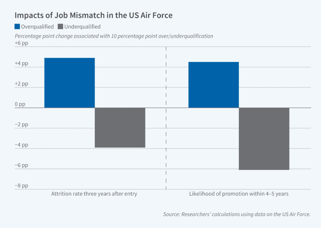 Beyond attrition, the people who are overqualified for their jobs display a range of problems. They manifest more behavioral issues, they get worse performance evaluations, and they do worse on general knowledge tests about the military. They seem, in other words, to be kind of pissed off and demotivated by being slotted into a career track that is beneath them.