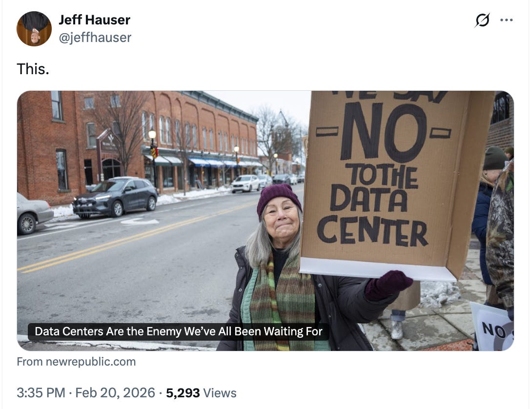 The tenor of the discourse is well-captured by Politico reporter Calder McHugh’s late-December article “Americans Hate A.I. Which Party Will Benefit?” but the conventional wisdom is widespread. Liza Featherstone in the New Republic wrote recently that “Data Centers Are the Enemy We’ve All Been Waiting for,” a take that was loudly echoed by Jeff Hauser, who runs a fake anti-corruption organization called the Revolving Door Project.