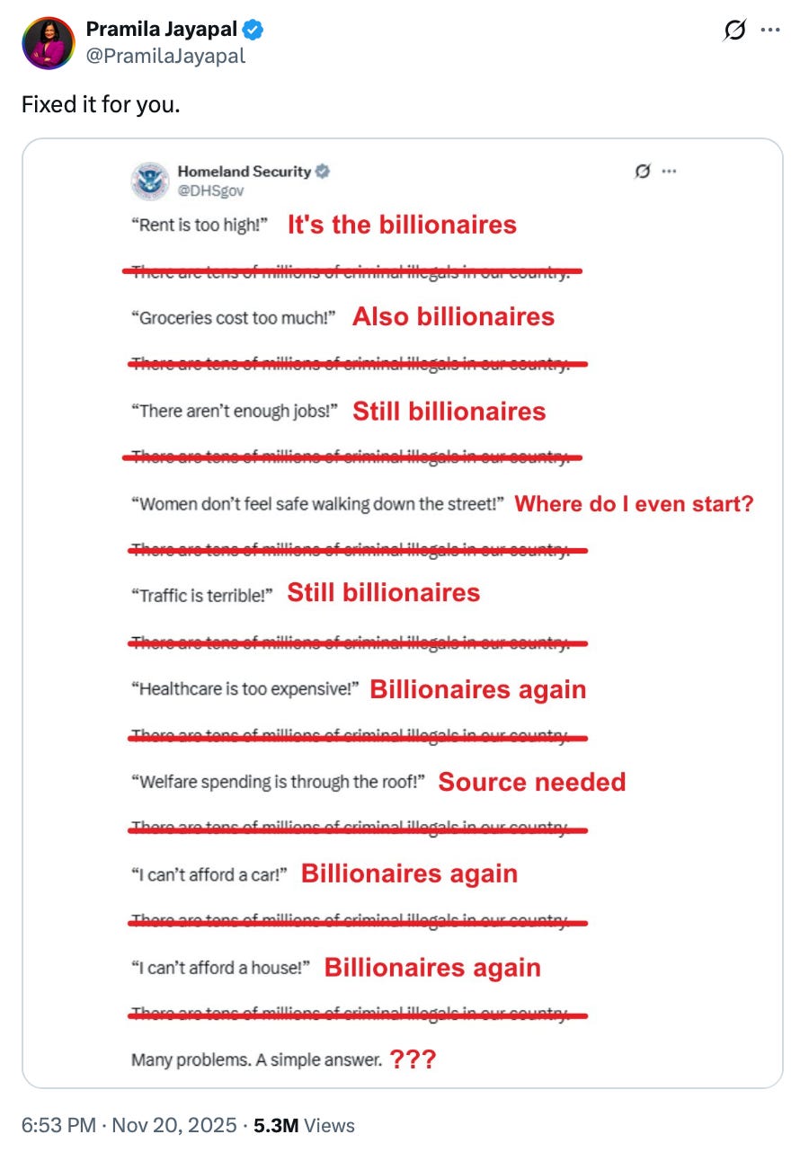 Back in November, the Department of Homeland Security put out an insane propaganda tweet asserting that immigrants are responsible for all the problems in American life, only to be met by a Pramila Jayapal retort that, actually, it’s all the fault of evil billionaires.