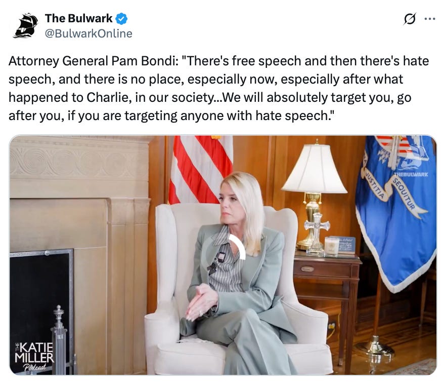 Attorney General Pam Bondi did the most ham-fisted version of this, going on Katie Miller’s podcast to claim that there is a hate speech exemption to the First Amendment and that “we will absolutely target you, go after you” if you violate it.