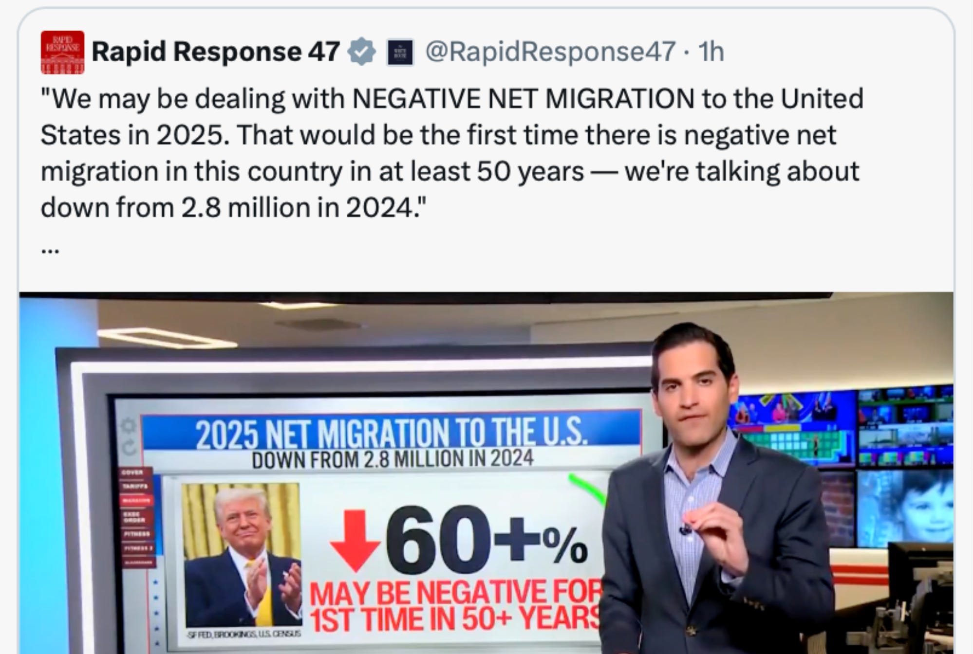 What’s not fine is if the president reacts to the news that shrinking the labor force slows job growth by wrecking the integrity of the jobs report. Or if foreign countries decide to re-evaluate the view that the United States of America is a friendly hegemon relative to the People’s Republic of China. In the short term, demand for data center construction can keep powering the economy forward one way or another, but investment booms always come to an end, and the wreckage Trump is making is going to be very hard to fix.