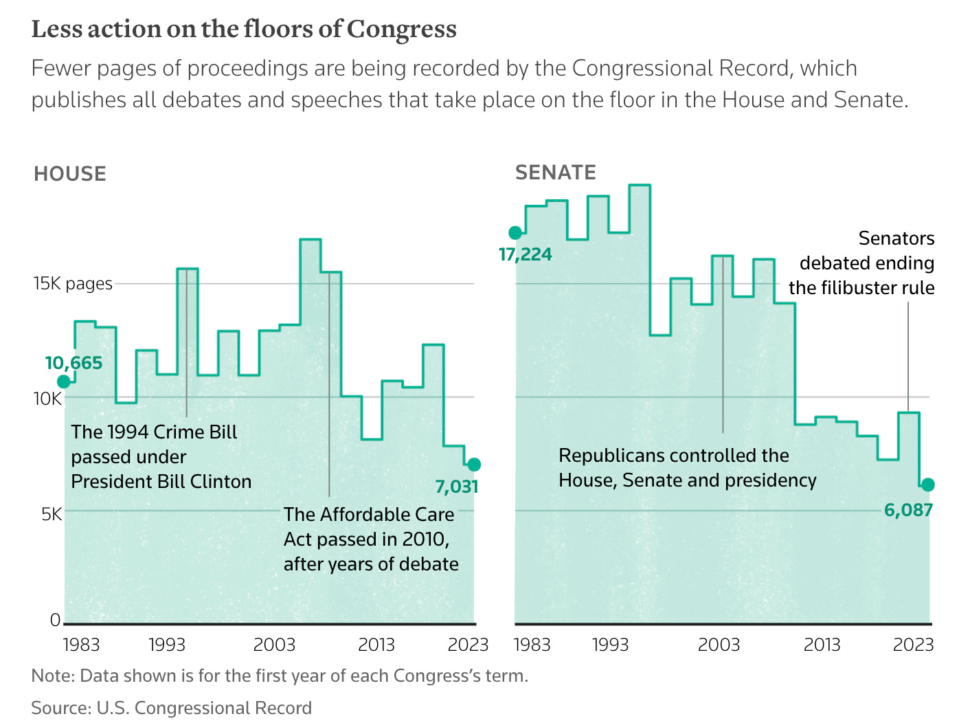 While Congress has accomplished some notable bipartisan legislative achievements, a recent Reuters report found that Congress is spending a historically low amount of time debating bills on the floor and sending legislation to the president’s desk. This is in part, due to the decline of bipartisanship and increase in polarization in Congress.