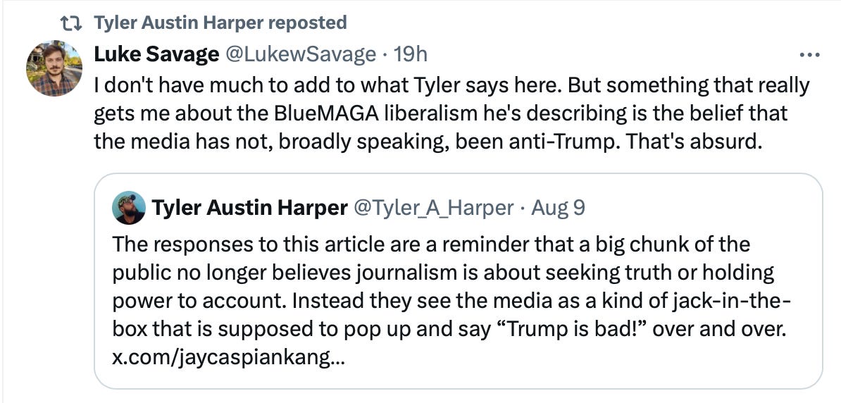 I don’t think that this is a very appealing look. And I really don’t think it makes sense to refer to the millions of rank-and-file Democrats who think the basic policy contrast between the parties is large and who are therefore not that interested in the details and mostly want to beat Trump as “Blue MAGA.” They are correct! The basic policy contrast is large and the vast majority of Democrats don’t need to hear the answers to any specific questions to know that. They want Harris to do things that will help her win the election, which is a very reasonable thing to want her to do. Her job at this point is, in fact, to win the election.