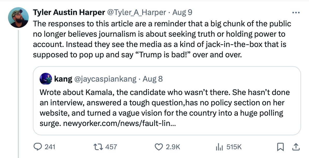 By the same token, I always wish reporters who got the chance to do these big-time interviews would take the chance to ask things they are genuinely curious about or that reflect concerns they sincerely believe the public has. In a generally very good set of polls for Harris, for example, The New York Times finds her up modestly in all three key swing states, with 44 percent of the public saying she is too liberal, 44 percent saying she’s just right, and only 6 percent saying she’s not leftwing enough. It would be good for the country for her to face some questions that get at this. But importantly, it would also be an opportunity for her! Of course, if she gives bad answers, she’ll look bad. But if she gets good questions that speak to widely held doubts about her and she gives good answers, people will find that reassuring. This doesn’t happen if a candidate insists on cocooning themselves in propaganda media. But it also doesn’t happen if interview-hungry journalists treat it like a challenge where the job is to shame politicians into engaging with the press and then attempt to embarrass them with gotcha questions when they do.