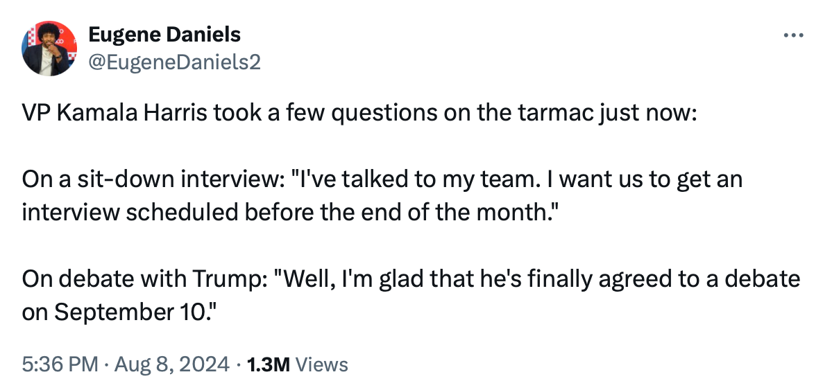 Harris has done minimal scrumming, no press conferences, and no interviews, and the collective judgment of the press corps seems to be that this was fine while she was leading the VP search, but enough is enough. Even when Harris did do one brief informal scrum, what she got was a question about interviews.