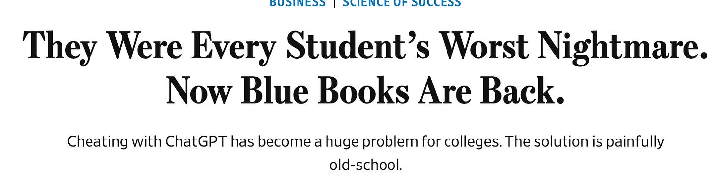I loved blue books! Really believe that timed in-class essays (can be open note) are a good way to measure someone’s understanding of the material.