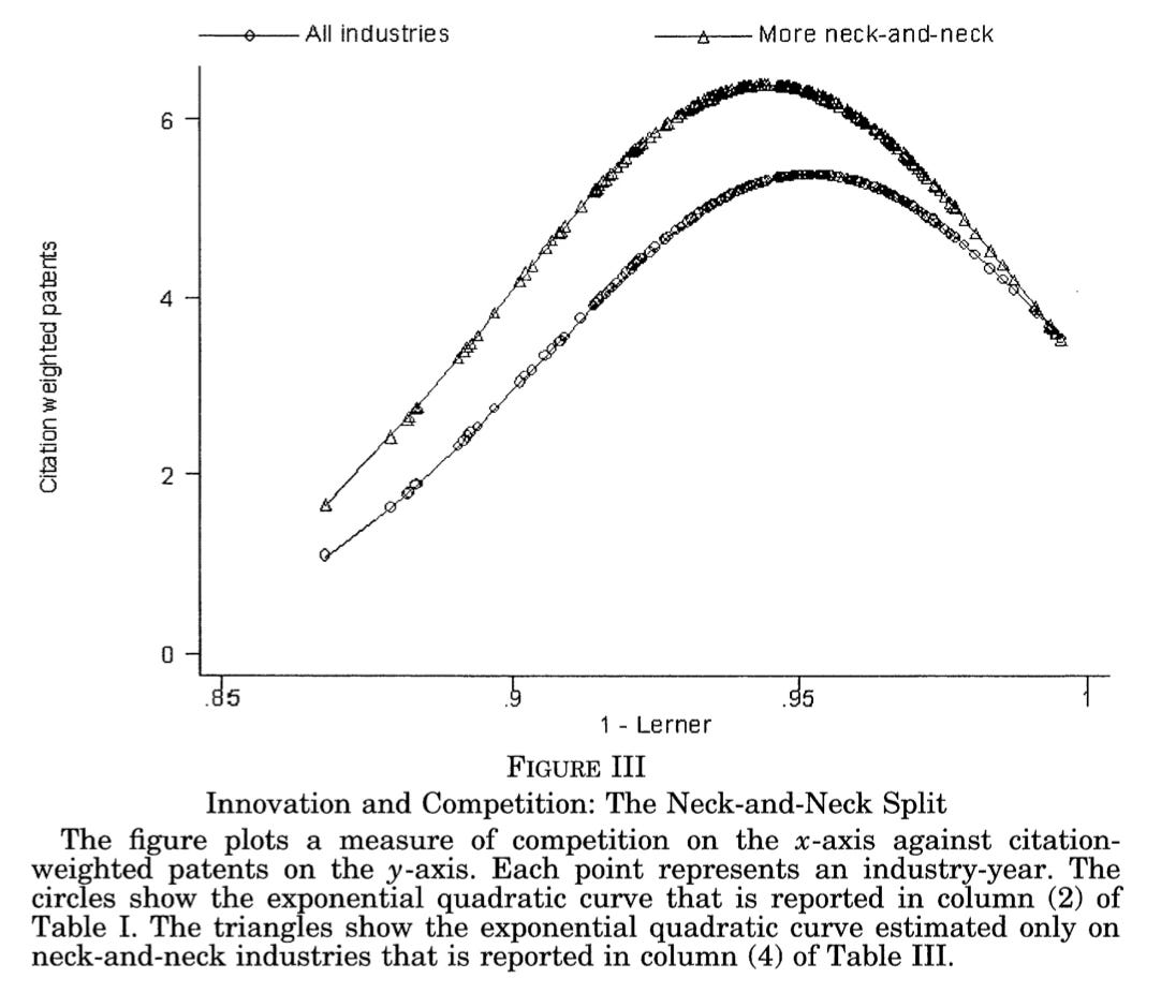 But that’s assuming a lot of competition. In an economy where companies have more market power, they are more able to profit sustainably from their innovations, and thus there may be more reason to maintain a high level of investment in research. On the other hand, a company with a genuinely impregnable monopoly may have no reason to bother innovating at all. In the later paper, they propose an inverted-U relationship between competition and innovation. True monopolization is bad, but they say you get the most patenting from companies that face moderate levels of competition.