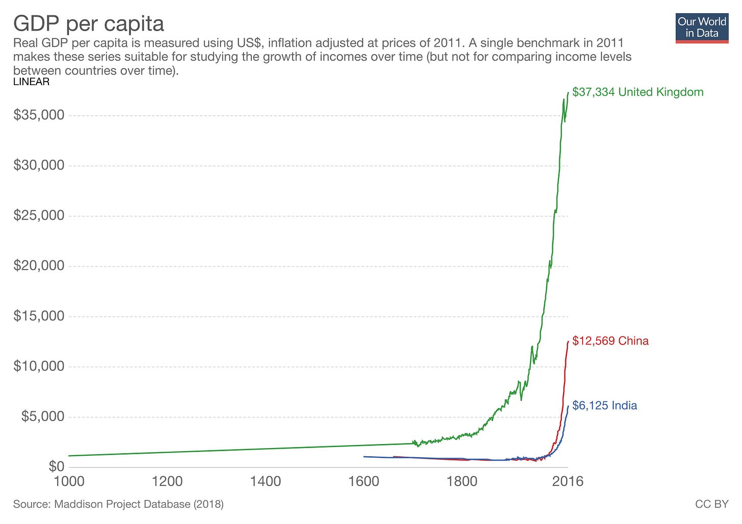 Ironically, though, he was writing at the very last moment of human history when that was plausibly true. Late 18th-century England was in the early steps of the economic takeoff known as the industrial revolution, which would spread to northwestern Europe and North America and then to the rest of Europe and to Asia over the next couple of centuries.