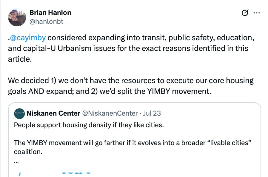 Of course, the point of the Elmendorf/Schleicher proposal is to try to embed YIMBYism in a broader nexus of moderate urban reform causes, which is certainly consistent with bipartisanship. And as I said, I would genuinely love to see more funding flow to the creation of multi-issue organizations along the lines they’re suggesting. But per Brian Hanlon’s points here, even in that context, I think there’s real value in sustaining genuine single-issue housing organizations.