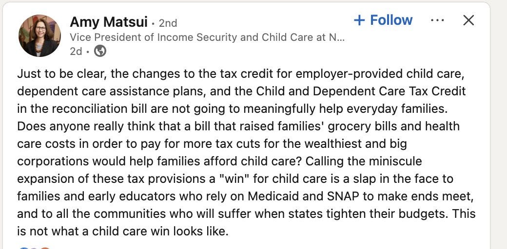 Sometimes this is downright comical. I heard a story about an abortion rights group canceling a canvassing campaign in support of a Democratic challenger in the 2024 cycle because they didn’t like a position she’d taken on border security. But often it’s more subtle. For example, Rachel Cohen wrote a good story about how there’s $16 billion in day care funding tucked away in OBBBA, which her article characterized as “a child care win.” Amy Matsui, who does child care policy at the National Women’s Law Center, blasted Cohen on the grounds that OBBBA is a bad law.