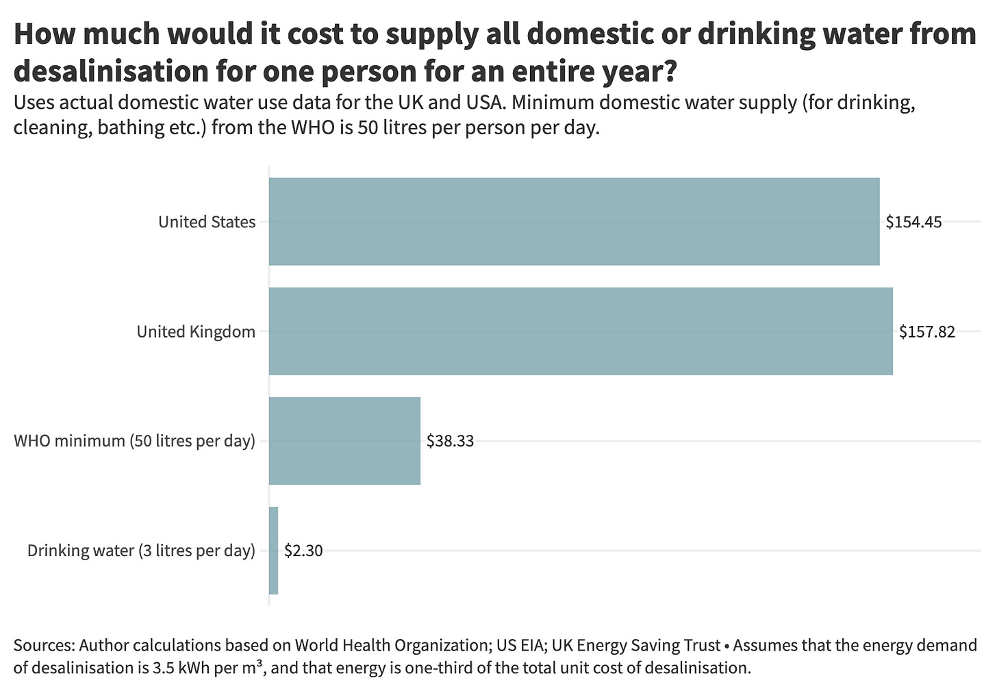 According to Hannah Ritchie’s calculations, we could desalinate the average American’s annual drinking water needs for $154.45, which is just not very much money.