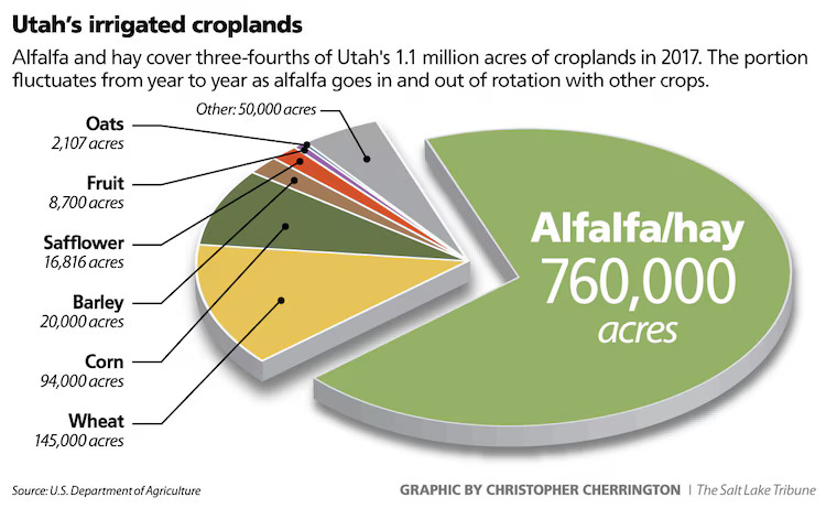 This is all made possible via the magic of rising crop yields, which has allowed the world’s population to grow dramatically even while per capita meat consumption soars. But it does use an awful lot of water. Here’s the Salt Lake Tribune showing what Utah uses its irrigated croplands for, and you can see it’s mostly alfalfa and hay.
