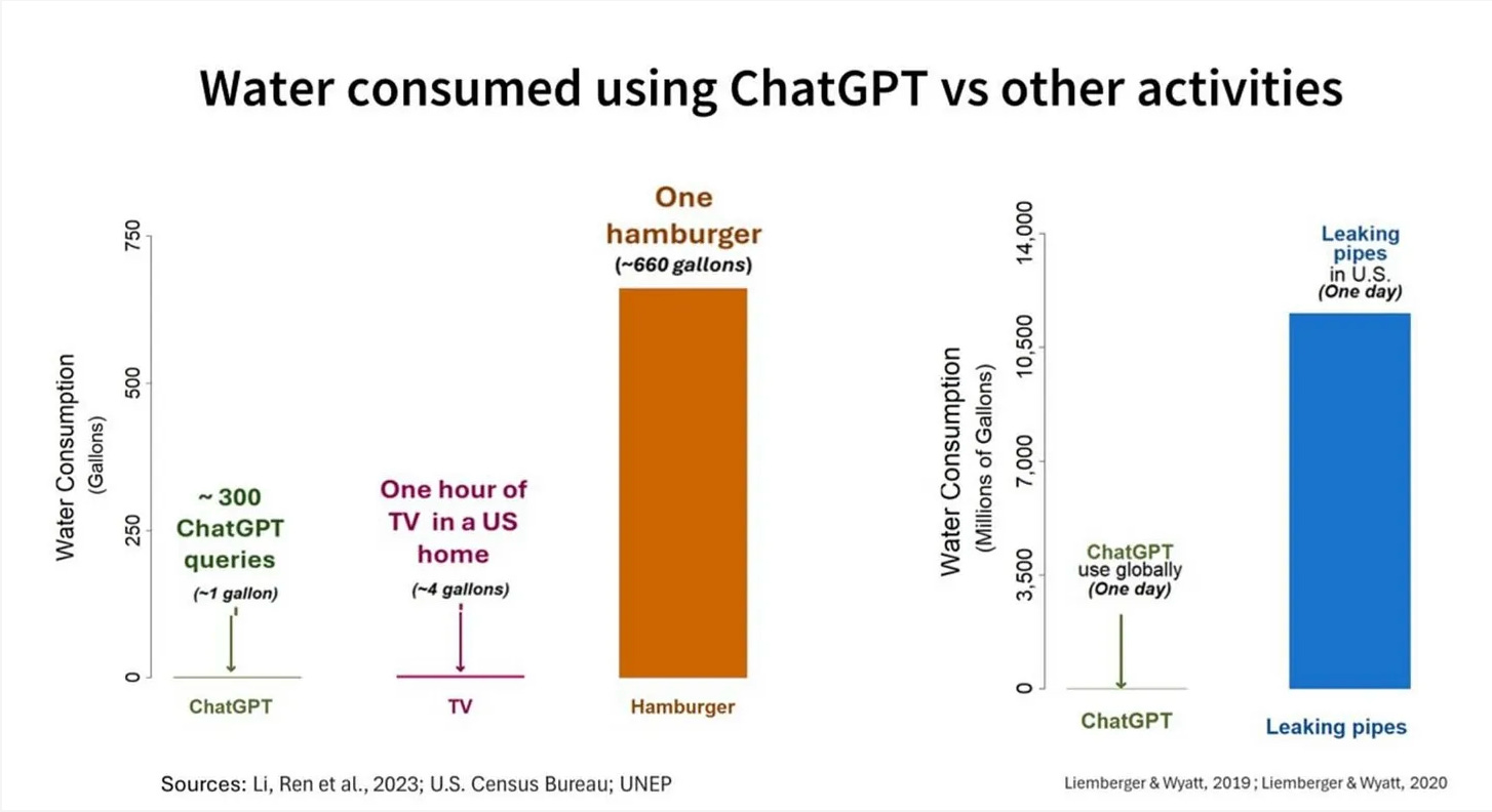 As Andy Masley points out in a great post on the environmental impact of AI, the water use of chatbots sounds like a lot primarily because most people are living their lives in a state of ignorance about the fact that electricity generation and data centers in general use water. If you watch a 4k streaming movie on Netflix, you are burning through many, many ChatGPT queries worth of water.