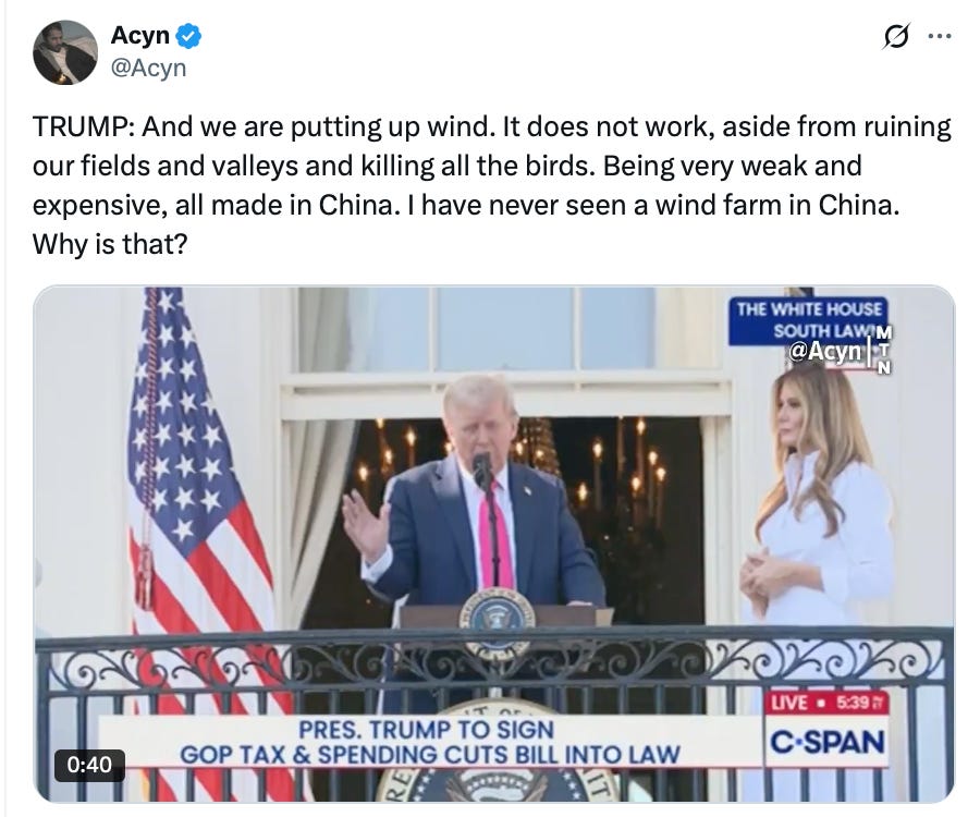 He’s not trying to create a zero-emission grid or reduce fossil fuel use in any way. But he’s not only rolling back tax credits for wind and solar production, he’s doing everything he can think of to raise new regulatory barriers to renewable deployment. He also keeps asserting that China doesn’t use renewable technologies, suggesting that the mere existence of wind and solar power is harmful.
