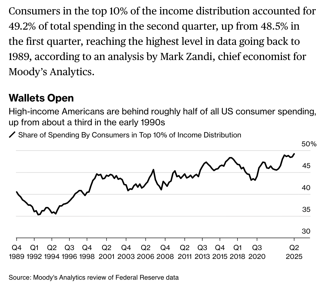 Bloomberg reports that new data suggests a small cohort of Americans buoys the economy. The outlet notes this comes at a time when job growth is slowing, debt delinquencies are on the rise, and persistent inflation is straining most families’ finances.