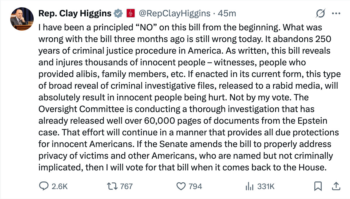 The House overwhelmingly approved a bill directing the Justice Department to release the Epstein files, with only one Republican dissenting: Louisiana’s Clay Higgins.