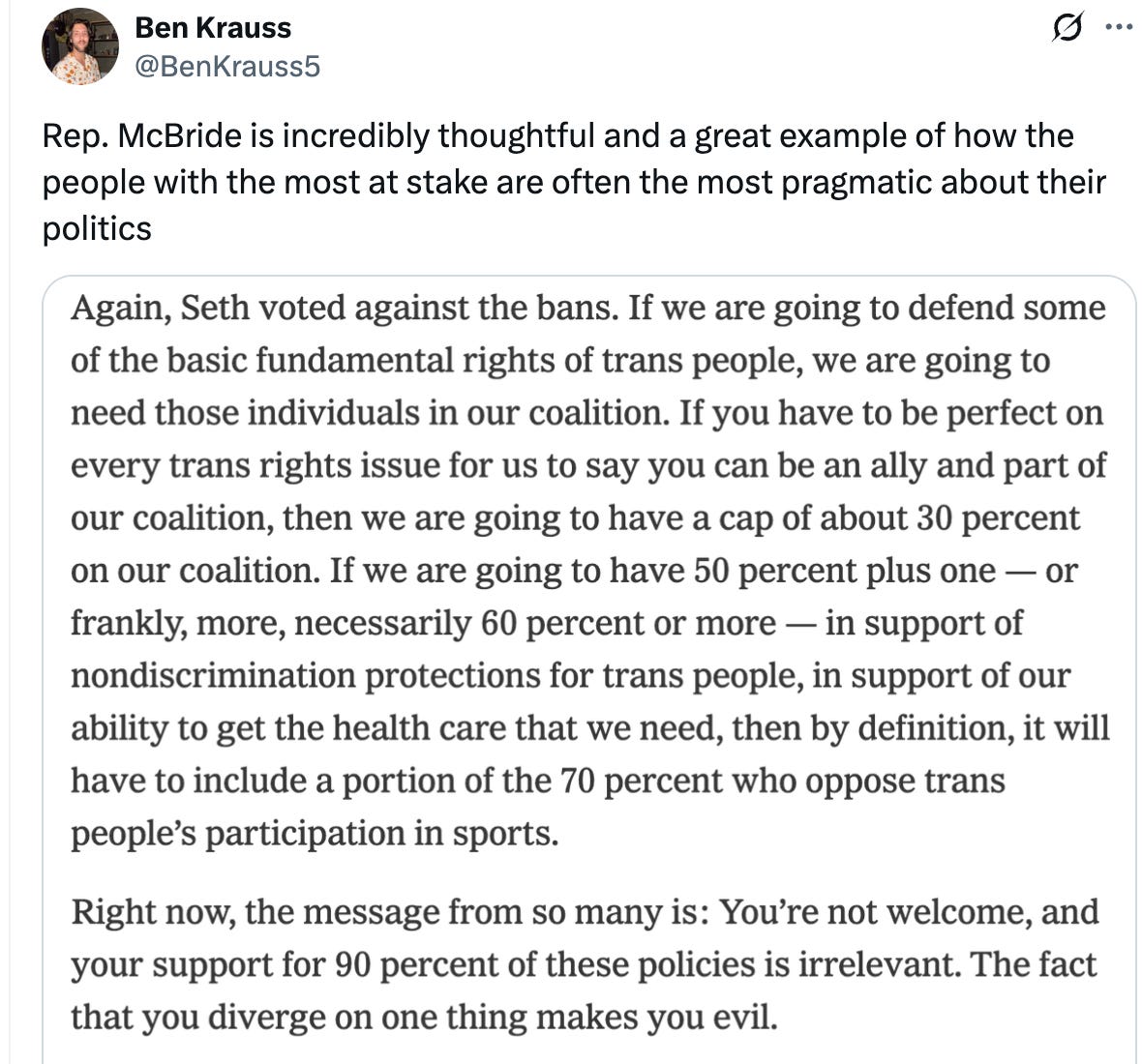 Gonna shamelessly link to my own tweet. But listen to this interview with Rep. McBride. I think her theory of politics is spot on and applicable to many other issues Link.