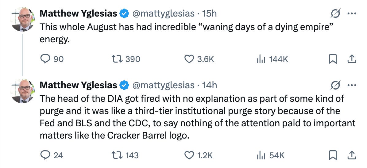 I think there will be a longish period after all this where the country’s wealth and institutional slack will mask the loss of expertise and erosion of law but at some point it will become obvious that everyone is much worse off. It’s been weird to see long term institutional actors (universities, businesses, health care industry) bend the knee hoping to ride it out rather than taking seriously the harm to their longterm interests. I get that doing so is expedient because Trump is vindictive and maybe things will go back to normal post 2028. But bending the knee also makes it much less likely things will go back to normal.