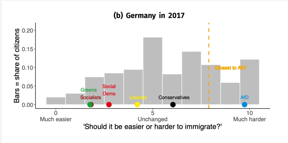This question, about reducing the vote share of Alternative for Germany (AfD), is actually different from the one studied in the accommodation literature. You can imagine a world in which the Social Democrats (SDP) move to the mid-point of the x-axis on immigration and this causes the vote share for both the Conservatives and the Liberals (a center-right party in the German context) to decrease dramatically as some voters embrace the SPD but others break right toward AfD. Whether that “works” depends on what you’re trying to achieve.