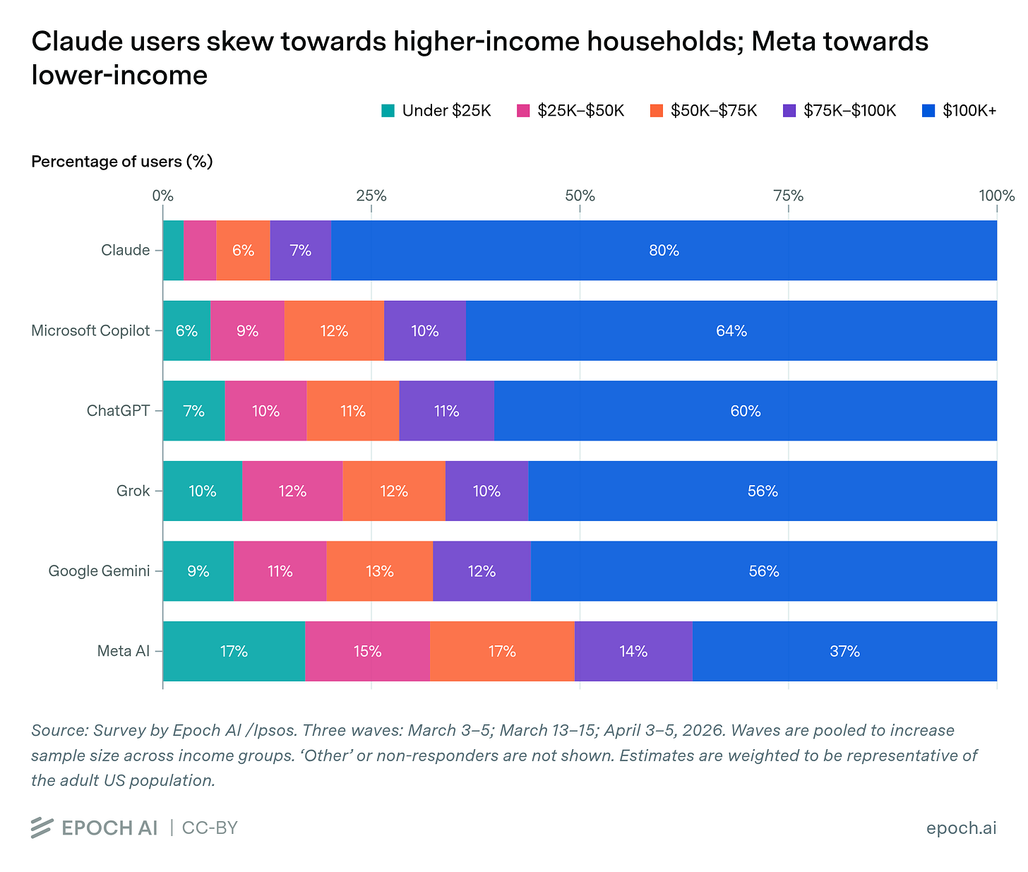 I suppose this isn’t a huge surprise, but I was interested to learn that there’s meaningful class divergence in choice of A.I. models, with Claude skewing more upscale and Meta skewing more downscale. I don’t quite know what that signifies, but maybe something!