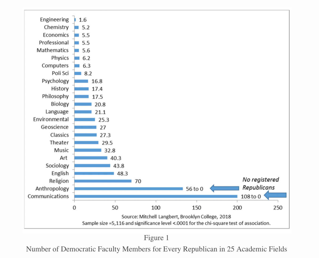 But in other areas, this same basic dynamic is really troubling. Because it’s actually not that there’s anything particularly special about lawyers. Essentially any field of endeavor that involves people with advanced degrees involves large leftward tilts. Even a field like chemistry has a 5:1 ratio of Democrats to Republicans in academia.