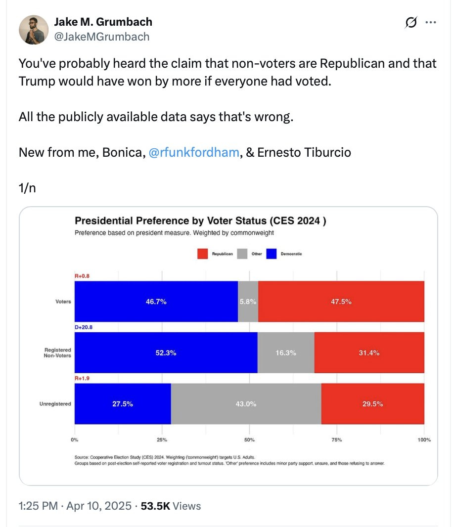 So I think it’s significant that some of the most prominent purveyors of hopium have largely thrown in the towel. New information shows definitively that the people who didn’t vote in 2024 are an even more Trump-friendly group than the people who did vote, and that untargeted voter registration and mobilization schemes are likely to help Republicans rather than Democrats.