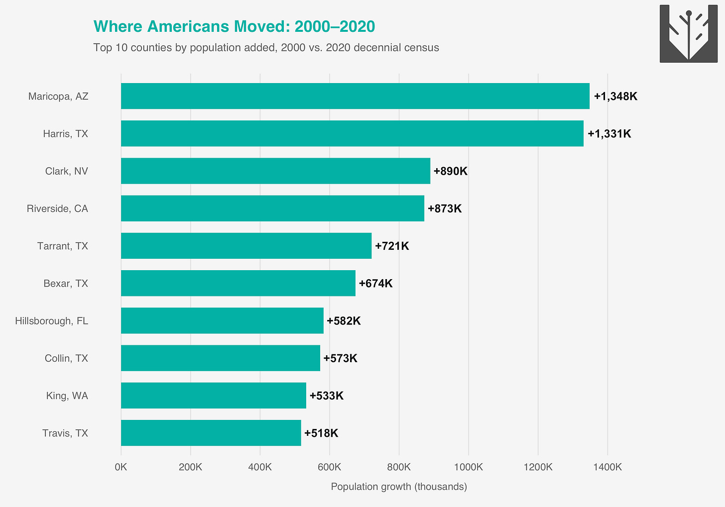 I get, of course, that “well, just move” is not the answer to the economic problems of struggling areas. At the same time, it’s just factually the case that millions of people did move during this period.