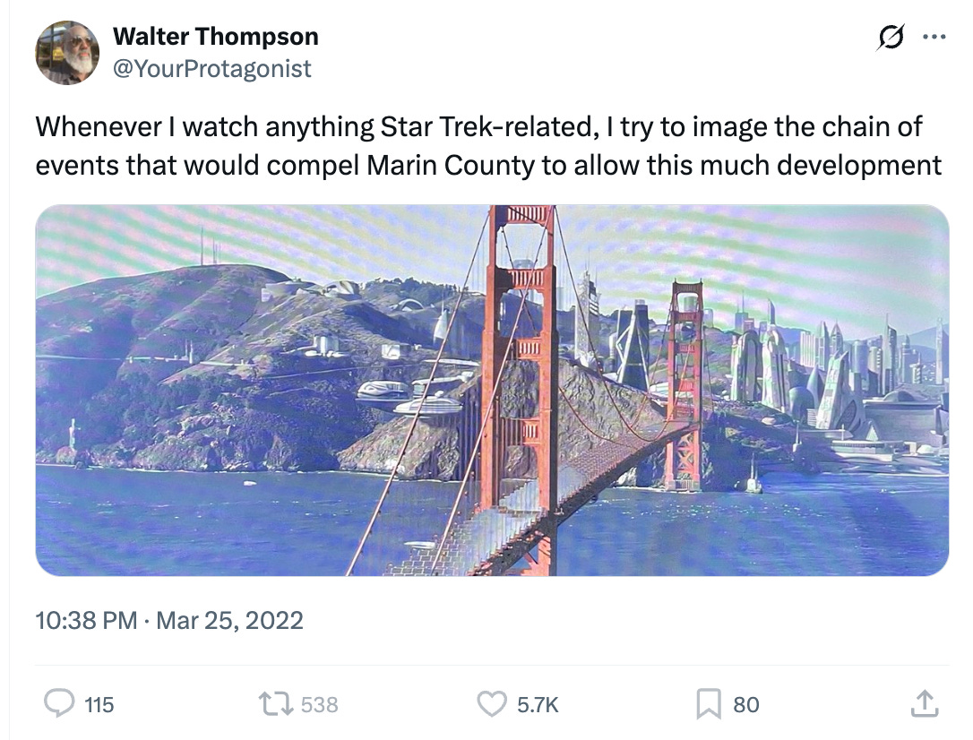 But it’s not the largest metro area in the world. Or the largest metro area in the country. Or even the largest metro area in California. And that’s despite the weather and basic natural amenities there being dramatically nicer than those that greeted people who moved to Chicago and Detroit and other industrial hubs during their boom times. Alongside the trillion-dollar valuations and insta-fortunes, we in some sense should have been building a Tokyo-scale megacity, with San Francisco looking like Manhattan, skyscrapers next to Caltrain stations, and Marin County featuring the apartment towers it’s depicted as having in “Star Trek: Picard.”