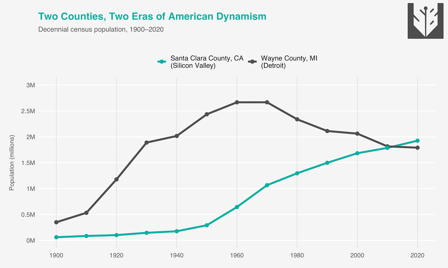 Santa Clara County in California, where Apple and Nvidia and many other tech companies are headquartered, had pretty fast growth from 1950 through 1970 as part of general suburbanization, but there is no 21st-century population boom.